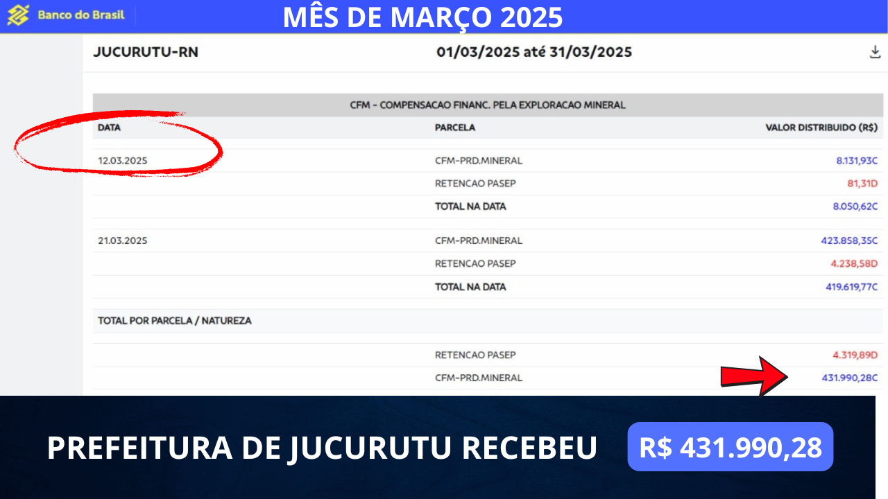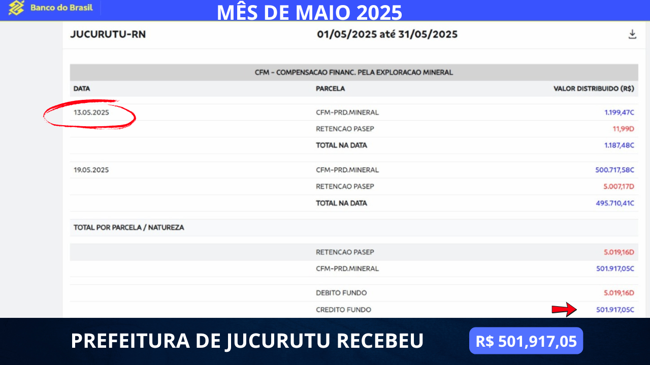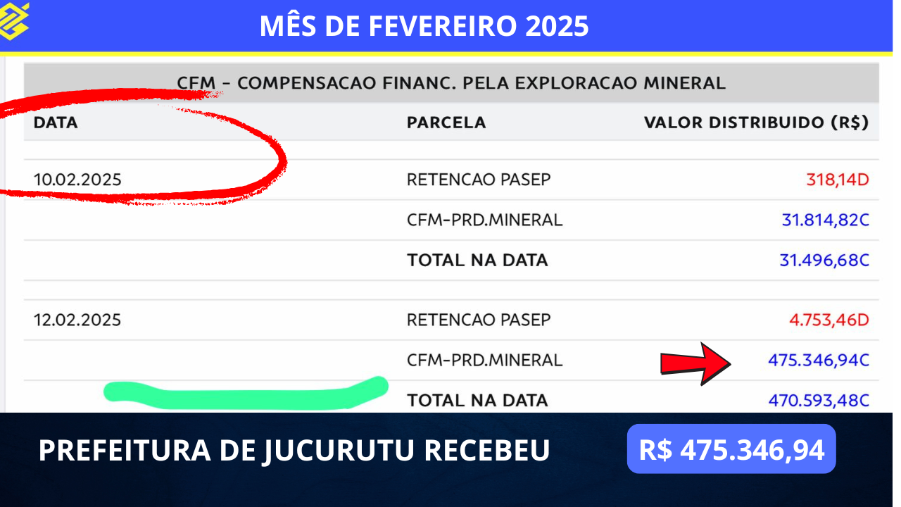 Enquanto muitos ainda desconhecem, o município de Jucurutu está recebendo uma verdadeira fortuna com a extração de minério de ferro na Mina do Bonito, localizada na zona rural da cidade. De dezembro de 2024 até junho de 2025, a Prefeitura Municipal já embolsou R$ 5.806.482,87 ( CINCO MILHÕES OITOCENTOS E SEIS MIL  QUATROCENTOS  E OITENTA DOIS MIL E OITENTA E SETE CENTAVOS),  por meio da CFM – Compensação Financeira pela Exploração Mineral.