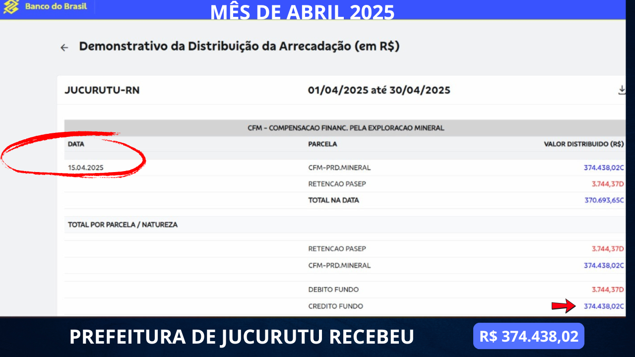 MÊS DE ABRIL  ANO 2025 – ENTROU NOS COFRES DA PREFEITURA VALOR DE R$ 374.438, 02 ( TREZENTOS E SETENTA E QUATRO MIL , QUATROCENTOS E TRINTA E OITO REAIS E DOIS CENTAVOS). CONFIRA NO DEMONSTRATIVO ABAIXO: