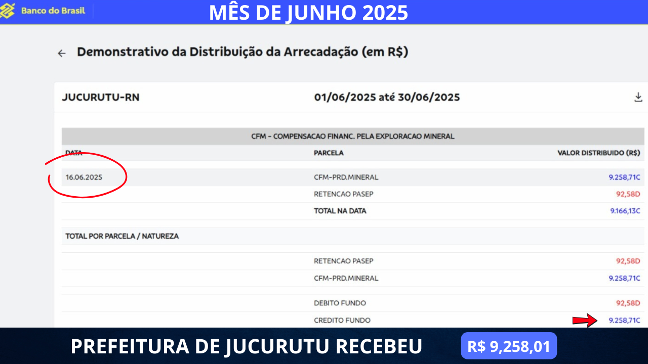 MÊS DE JUNHO  ANO 2025 – ENTROU NOS COFRES DA PREFEITURA VALOR DE R$ 9.258,01 (NOVE MIL DUZENTOS  E CINQUENTA E OITO REAIS E SETENTA E UM CENTAVOS20). CONFIRA NO DEMONSTRATIVO ABAIXO: