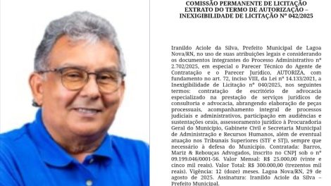 A Prefeitura de Lagoa Nova, administrada pelo prefeito Iranildo Aciolo da Silva, autorizou a contratação direta — sem processo licitatório — de um...