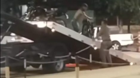 Um homem que teve a moto apreendida durante uma blitz foi até a frente da sede do Comando de Policialmento Rodoviário Estadual, subiu no caminhão...