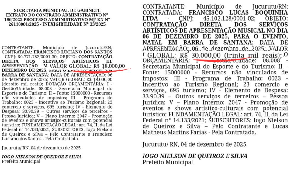 Após a cobrança feita pelo blog, a Prefeitura divulgou, no Diário Oficial desta segunda-feira, 08 de dezembro de 2025, os valores referentes às atrações musicais do Natal em Barra de Santana...